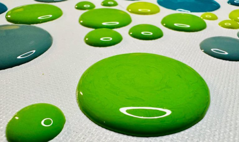 Meine DotArt-Bilder bestehen aus großen, glänzenden Punkten, die ineinander fließen oder pikiert Abstand halten. Hier verwischt jede Strenge, die Farbe fließt satt und träge aus ihrer Flasche.